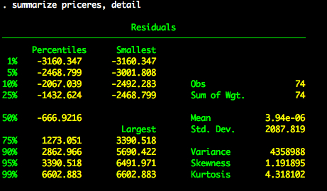 Suppose we want to obtain the partial correlation between price and mpg controlling for weight and foreign. To do this we need the part of price that is independent of weight and foreign. We also need the part of mpg that is independent of weight and foreign. We can get this information with residuals.